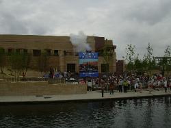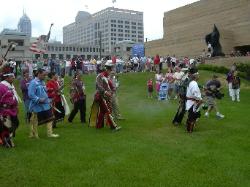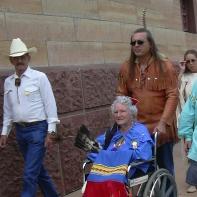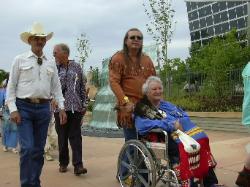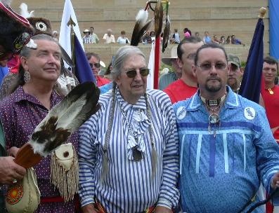 | The Wea Indian Tribe of Indiana attended the opening of the Mel and Joan Perelman Wing of the Eiteljorg Museum in Indianapolis on June 11, 2005. Chief Terry Stuff of the Wea Indian Tribe of Indiana was requested by Chief Brian Bucannan of the Miami Nation of Indians of the State of Indiana to walk together in the procession dedicating this new wing. Pictured here are Cheif Terry Stuff, Wau-pa Shing and Chief Brian Bucannan. |